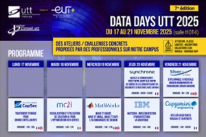 - Datadays : 7ème édition du 17 au 21 novembre 2025 à l’UTT17 novembre 2025La 7ème édition des #DataDaysUTT se tient du 17 au 21 novembre 2025 sur le campus de l’UTT à Troyes.