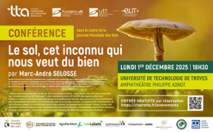 - "A l’Aube des sols" : Une semaine pour apprendre, débattre et agir ensemble au service de la terre - Du 1er au 6 décembre 2025 à l’UTT et dans l’Aube18 novembre 2025À l’occasion de la Journée mondiale des sols 2025, la chaire Transitions des Territoires Agricoles de l’Université de technologie de Troyes (UTT) et ses partenaires se mobilisent pour célébrer et mieux comprendre ce bien commun essentiel à la vie. Du lundi 1er au samedi 6 décembre 2025, rencontres conviviales, échanges et découvertes permettront d’explorer la richesse et la diversité des sols sous différents angles. Grand public, professionnels agricoles, agents et élus du territoire sont invités à partager leurs regards et leurs expériences autour d’un même enjeu : préserver et valoriser nos sols pour les générations futures. Une semaine pour apprendre, se laisser surprendre par ce bien commun qui se trouve sous nos pieds, et débattre et agir ensemble au service de la terre.