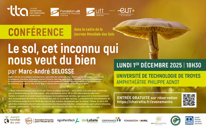 À l’occasion de la Journée mondiale des sols 2025, la chaire Transitions des Territoires Agricoles de l’Université de technologie de Troyes (UTT) et ses partenaires se mobilisent pour célébrer et mieux comprendre ce bien commun essentiel à la vie. Du lundi 1er au samedi 6 décembre 2025, rencontres conviviales, échanges et découvertes permettront d’explorer la richesse et la diversité des sols sous différents angles. Grand public, professionnels agricoles, agents et élus du territoire sont invités à partager leurs regards et leurs expériences autour d’un même enjeu : préserver et valoriser nos sols pour les générations futures. Une semaine pour apprendre, se laisser surprendre par ce bien commun qui se trouve sous nos pieds, et débattre et agir ensemble au service de la terre.