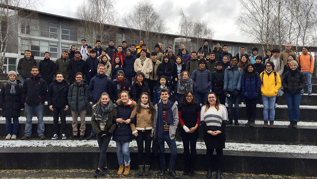 Photo de groupe des arrivants étrangers du semestre de printemps P19 dans l'amphi verdure de l'UTT ; ce sont ainsi près de 85 étudiants de nos universités partenaires, en Europe et dans le reste du monde, qui ont fait le voyage pour venir étudier un mois, un semestre ou 5 ans à l'UTT.