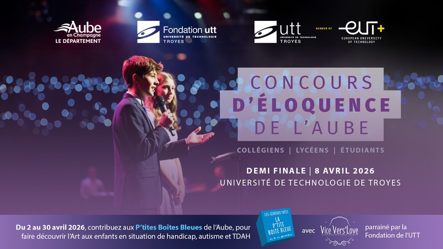 L’UTT et la Fondation UTT, en partenariat avec le Département de l’Aube, organisent une nouvelle édition du Concours d’Éloquence, destiné à révéler et encourager les talents oratoires du territoire, des collégiens, lycéens et étudiants.