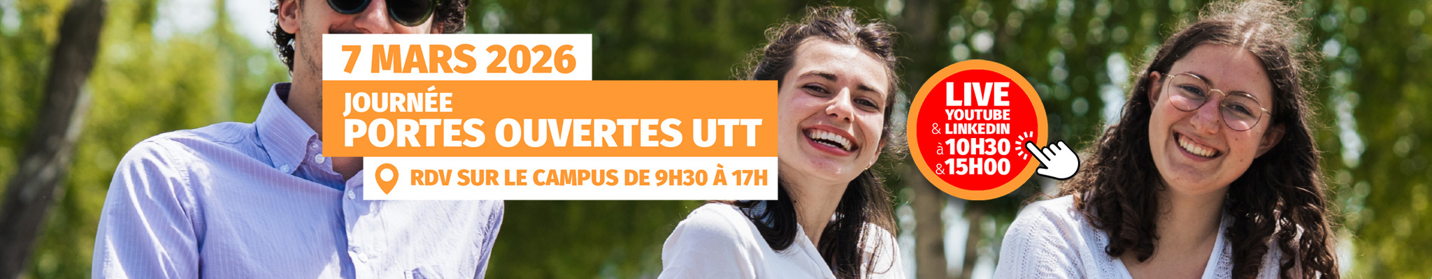 - Présentation générale de l'UTT, en amphithéâtre à 10h30 et 12h00 avec un focus sur les admissions en spécialités à 15h00. Les présentations de 10h30 et 15h00 seront diffusées en live sur notre chaine Youtube.