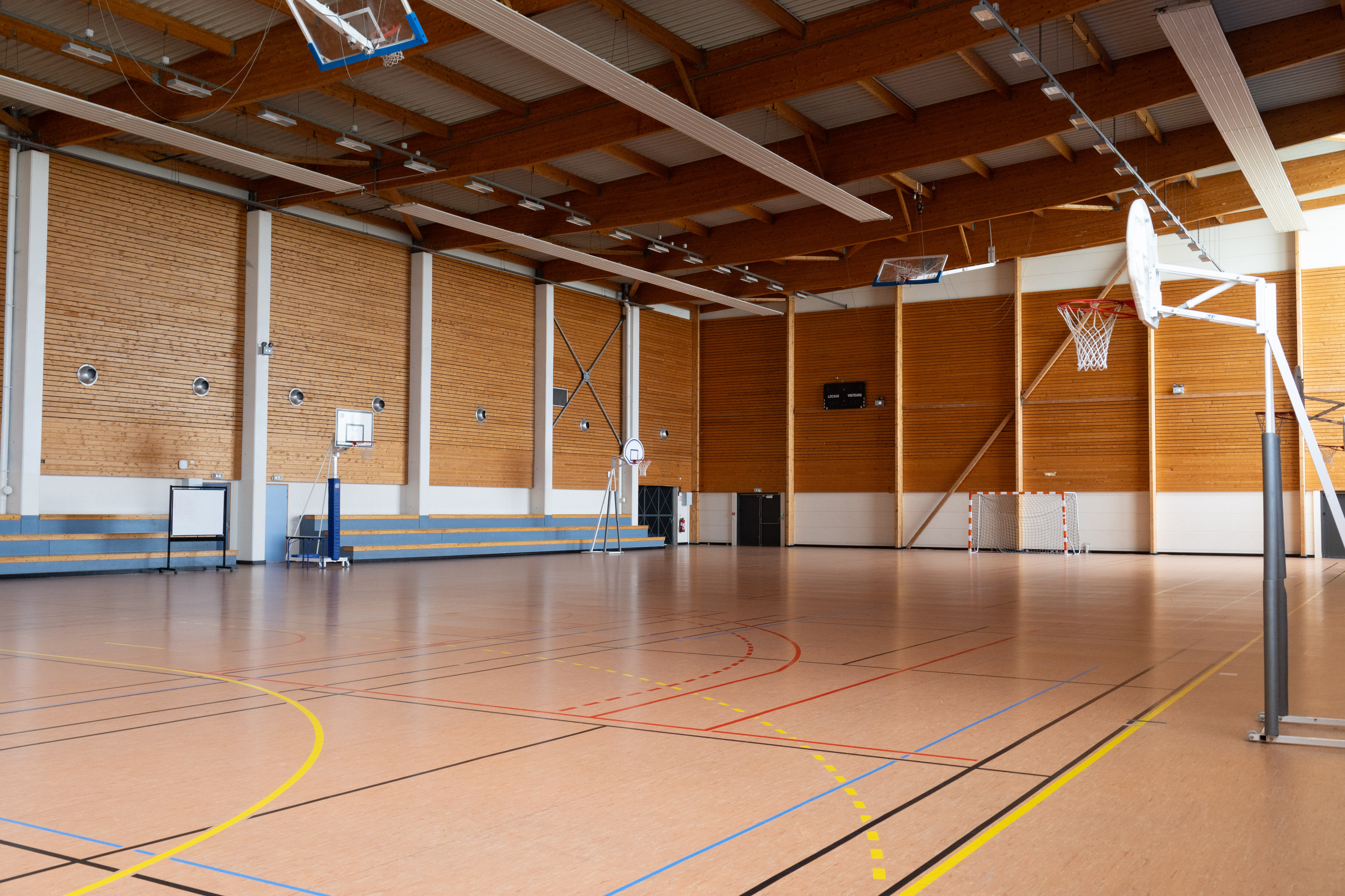 - Une grande salle avec un terrain de handball, un terrain de basketball, trois terrains de volleyball et 7 terrains de badminton.